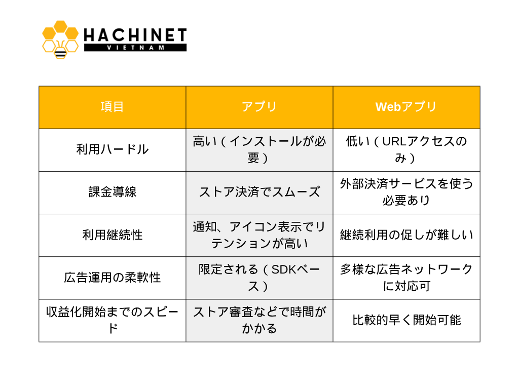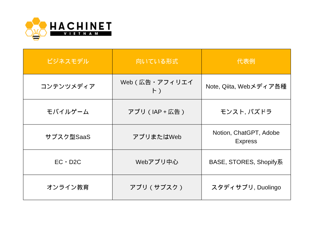 つまり、「定着させて育てるモデル」にはアプリ、「幅広く集めて回すモデル」にはWebが向いています。