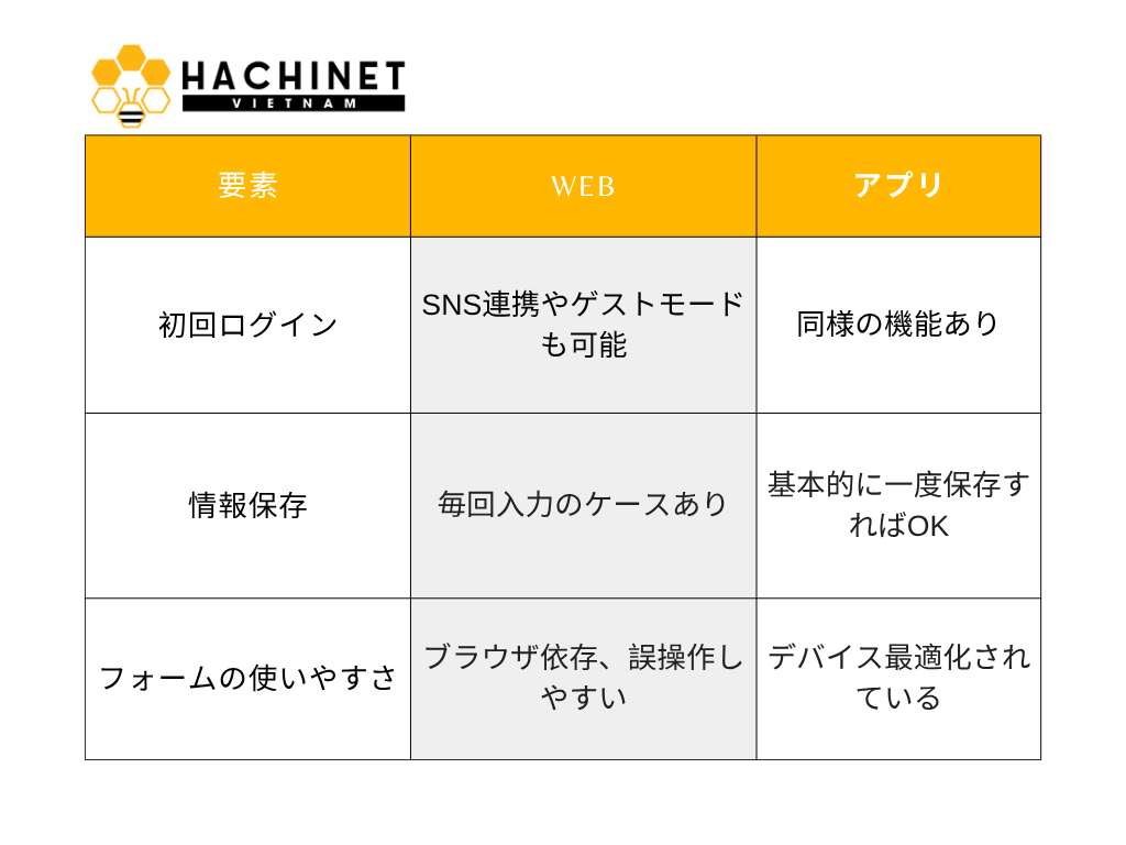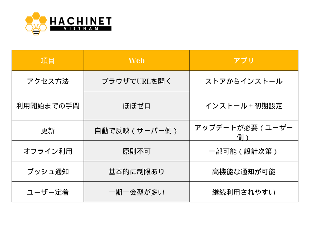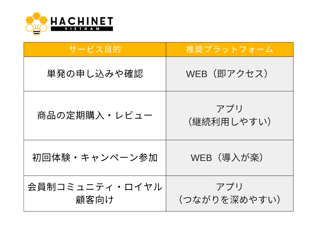 このように、Webは即時性・軽さに優れ、アプリは機能性・定着率に強みがあるという構造です。
