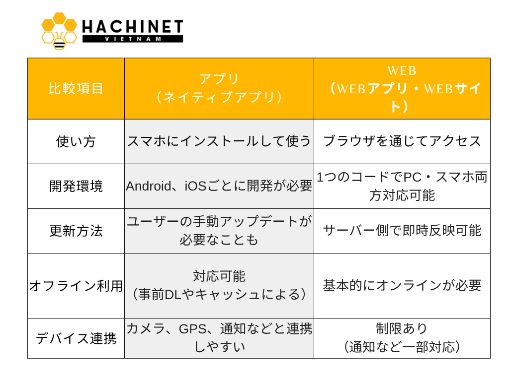 まずは、「アプリ」と「Web」の基本的な違いをわかりやすく整理してみましょう。