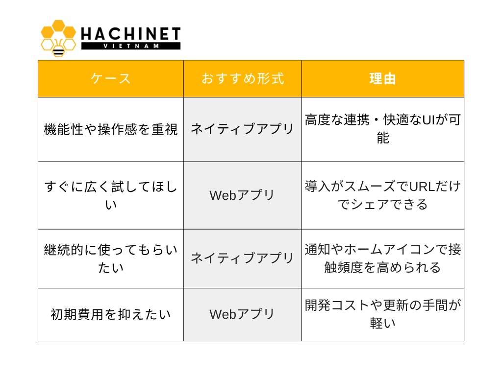 「アプリ」はより深い機能が使える反面、手間もかかりがちです。一方「Web」は導入のハードルが低く、更新や改善が早いという利点があります。