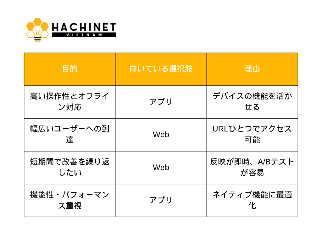 アプリとWeb、どちらを選ぶかはサービスの目的やユーザー像によって変わります。