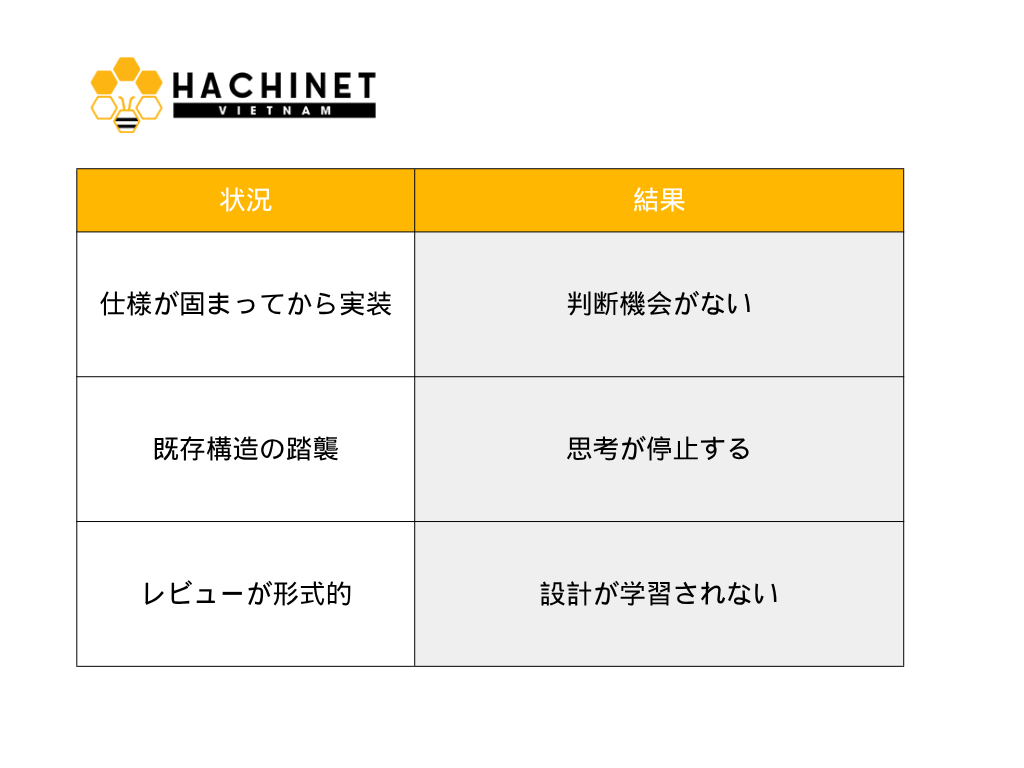 結果として、コードは書けるが、設計を任せられないエンジニアが生まれます。