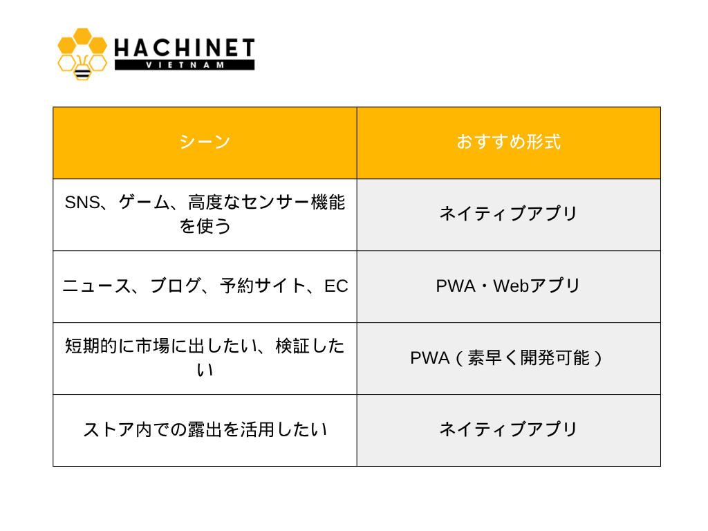 選択肢としては、「PWA」「ネイティブアプリ」「ハイブリッドアプリ」の3つがあり、それぞれの向き不向きがあります。