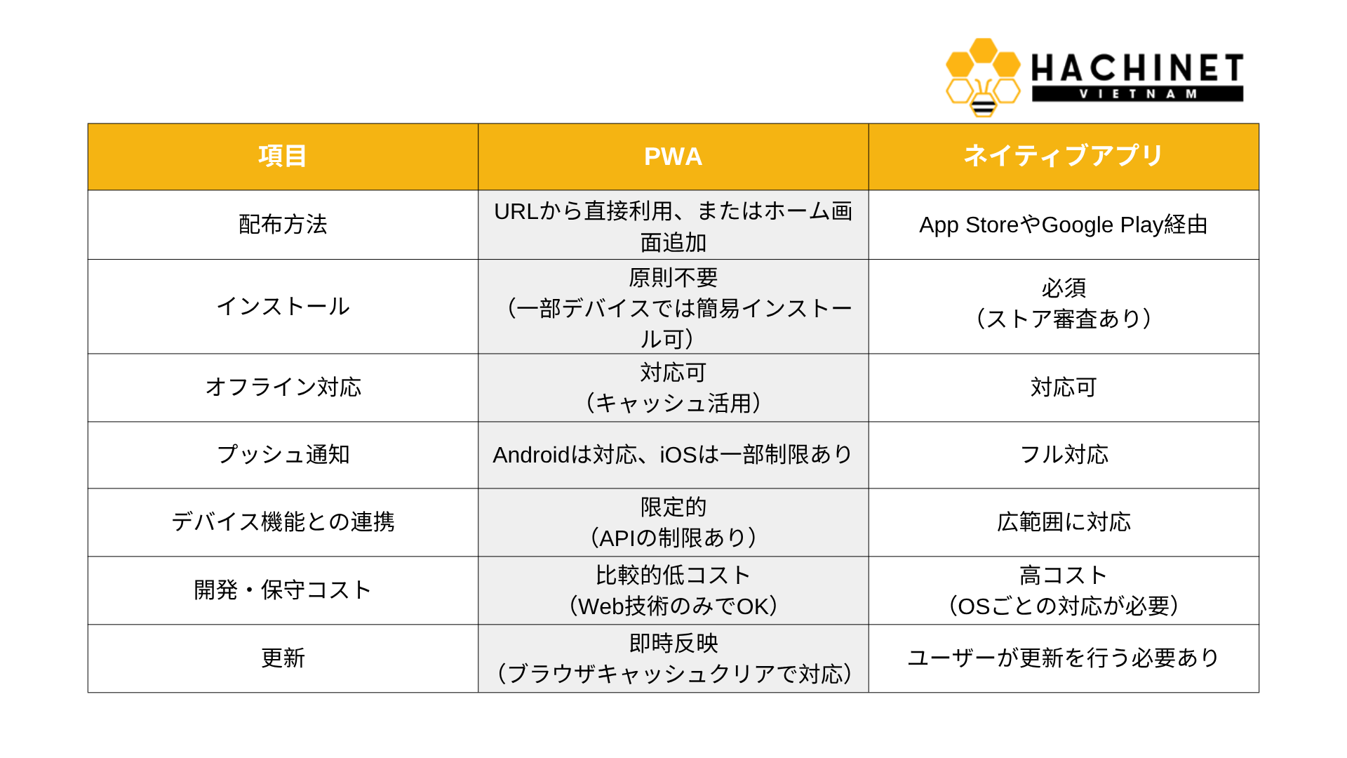 以下は、PWAとネイティブアプリの代表的な違いをまとめたものです。