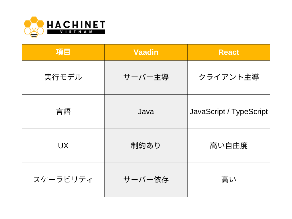 ここでのポイントは、どちらが優れているかではなく「前提が異なる」という点です。Vaadinはサーバー中心設計、Reactはクライアント中心設計です。