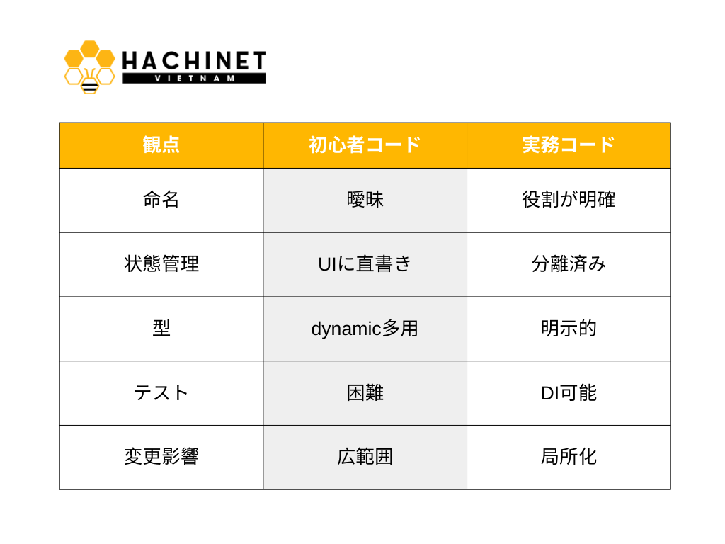 初心者コードと実務コードの決定的な違いは、以下の点にあります。