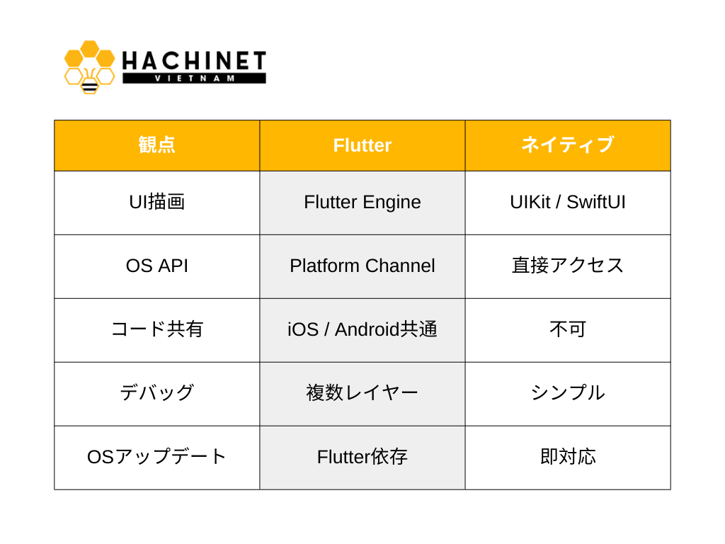 Flutterとネイティブ開発の違いを整理すると次のようになる。