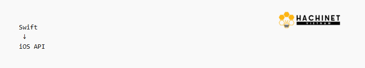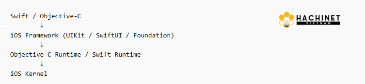 この構造ではアプリコードが直接iOSのフレームワークを利用する。つまりOSの機能やUIコンポーネントに最短距離でアクセスできる。