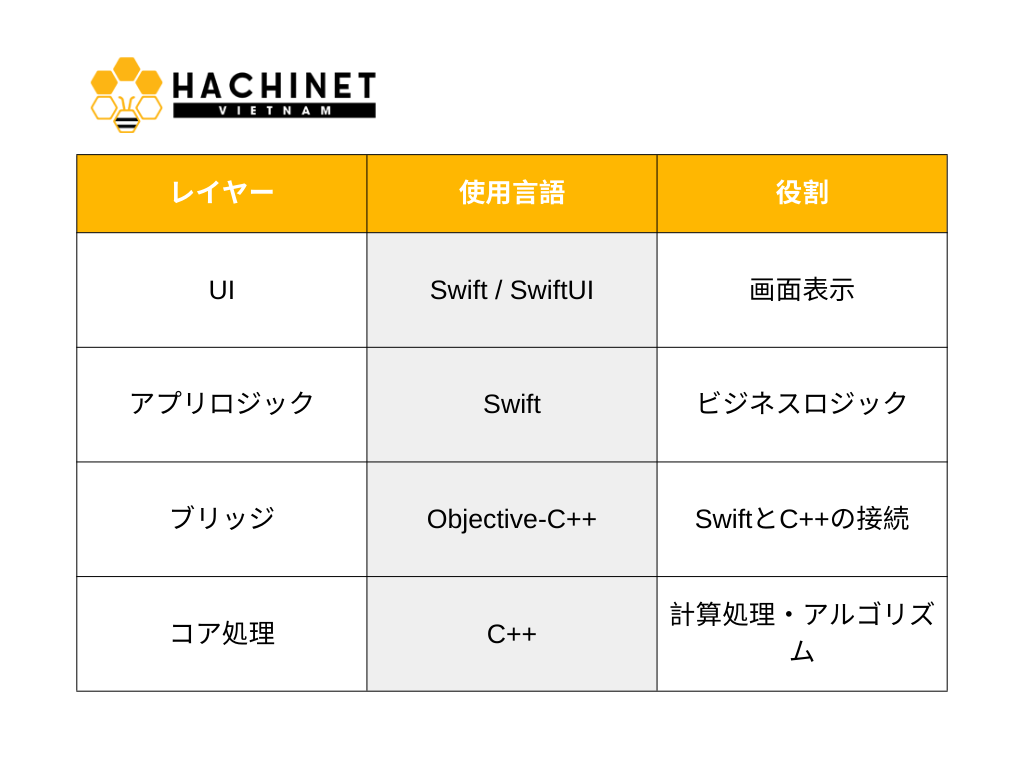 Objective-C++はObjective-CとC++を同時に扱える拡張であり、SwiftとC++の橋渡し役として利用されます。この仕組みによって、SwiftアプリからC++ライブラリを呼び出すことができます。