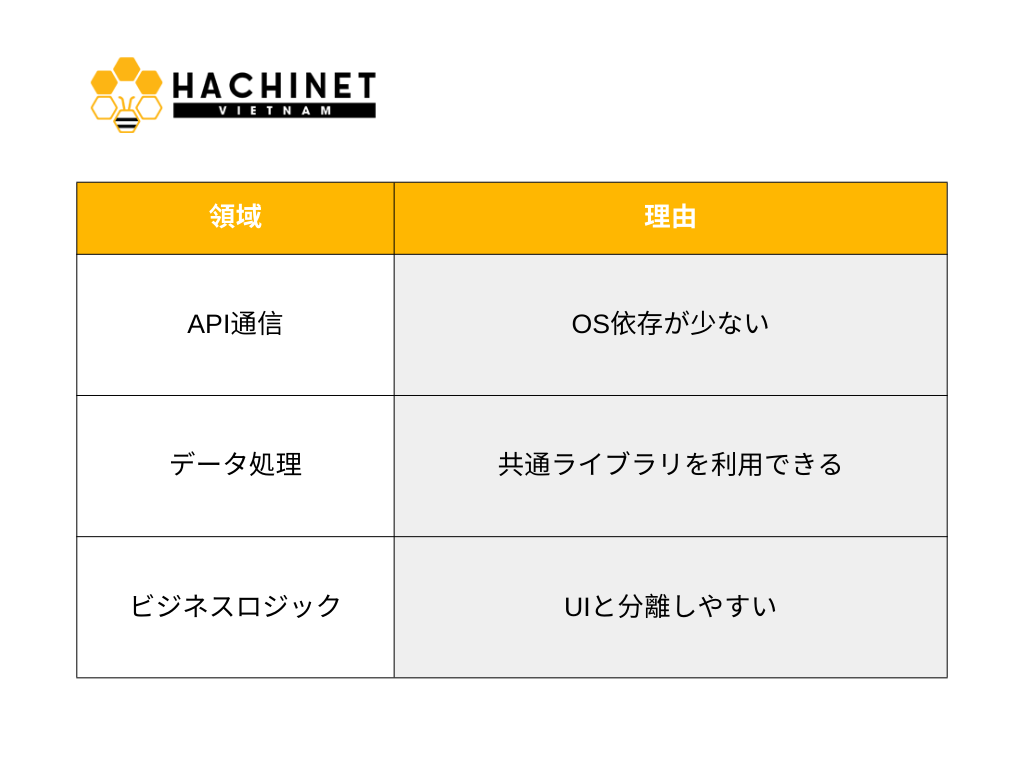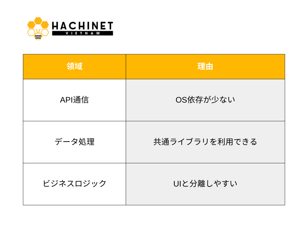 例えばAPIレスポンスの解析やドメインロジックは、AndroidとiOSで別々に実装されることが多い。