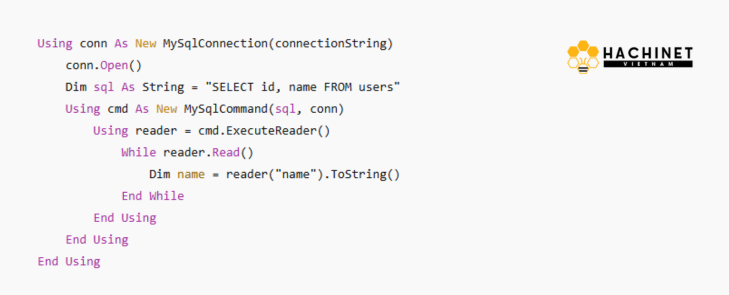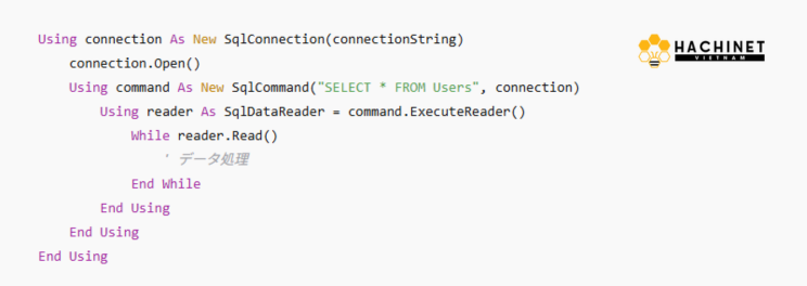 Using構文を使うことで、接続が自動的に解放されるため、安全で安定したコードになります。