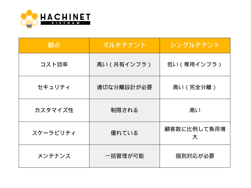 → シングルテナントが適しています。顧客ごとの独自要件に柔軟に対応でき、セキュリティ要件にも対応しやすいです。