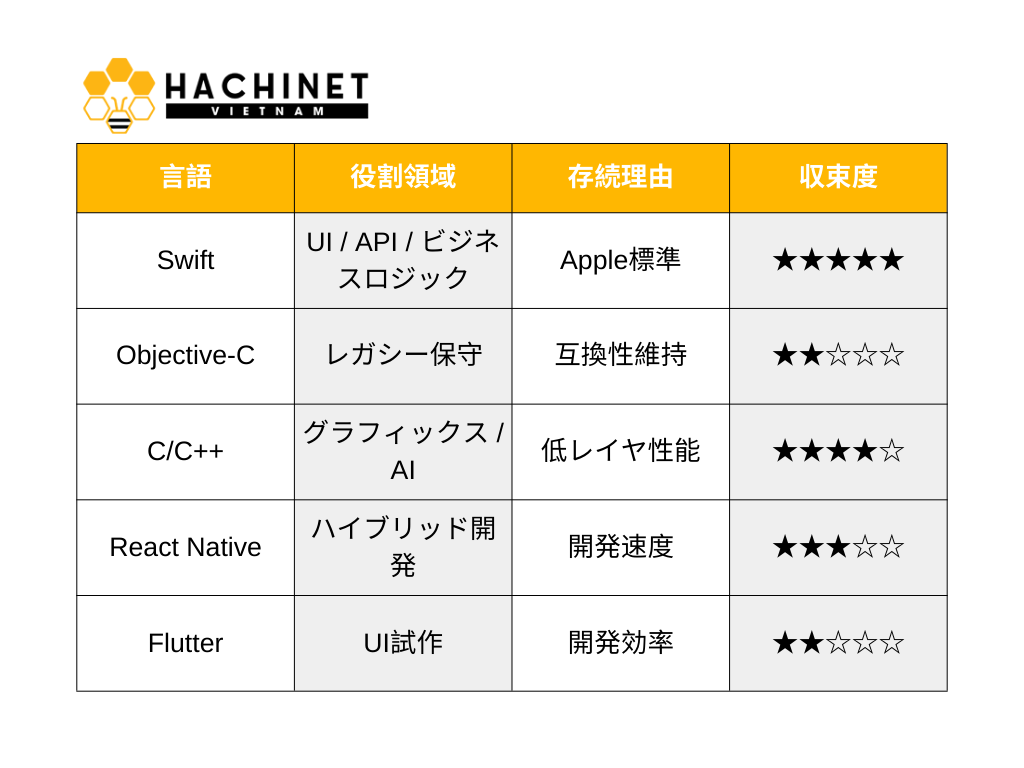 言語が統一されない理由は、技術的制約よりもAppleの思想にあります。長期運用、後方互換性、そしてパフォーマンス。この3つを同時に満たすには、単一言語では不十分です。