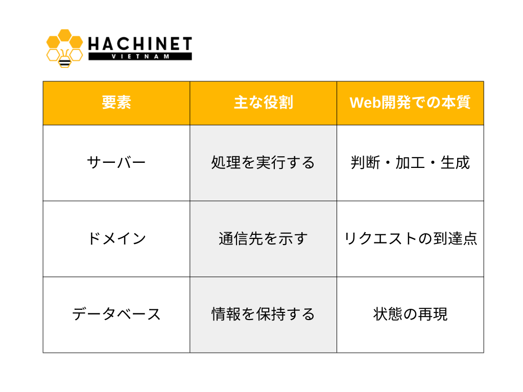 まず、サーバー・ドメイン・データベースの役割を整理します。